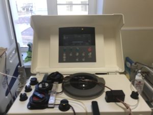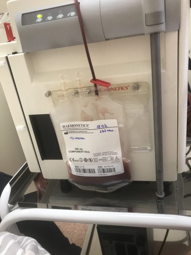 Gleich um 7.30 ging es los, die Pflegefachfrau klopfte an die Tür und stellte ein grosses Gerät auf Rollen, eine Zentrifuge, in mein Zimmer, Ich lag immer noch schlaftrunken und ein bisschen benommen im Bett. Sie verschwand für eine Weile im Korridor, kam zurück und verband mit einem dünnen Schlauch meinen Halskather mit der Maschine. Dr. Fedorenko kam herein und erklärte mir das Prozedere: «Während rund 5 – 6 Stunden läuft Ihr Blut zwei Mal durch die Maschine und Ihre Stammzellen werden in diesem Plastikbeutel gesammelt. Danach kontrollieren wir, ob wir genügend Stammzellen haben. Ist dies der Fall, dann reicht ein Durchgang. Sonst machen wir morgen einen zweiten Anlauf. Wenn Sie etwas brauchen sollten, dann klingeln Sie der Pflegefachfrau. Haben Sie noch Fragen?“