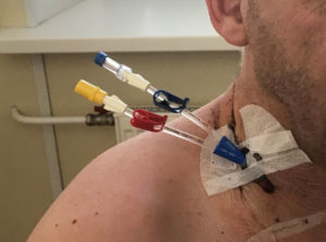 Gegen 20.00 wurde mir der überdimensionierte Doppelkatheter gezogen – der mich an einen Blumenstrauss erinnerte, der für die Entnahme der Stammzellen nötig war. Nur der obere, sichtbare Teil, wurde entfernt. Der untere, unsichtbare Teil, blieb im Körper für die Chemotherapie und andere Medikamente stecken.