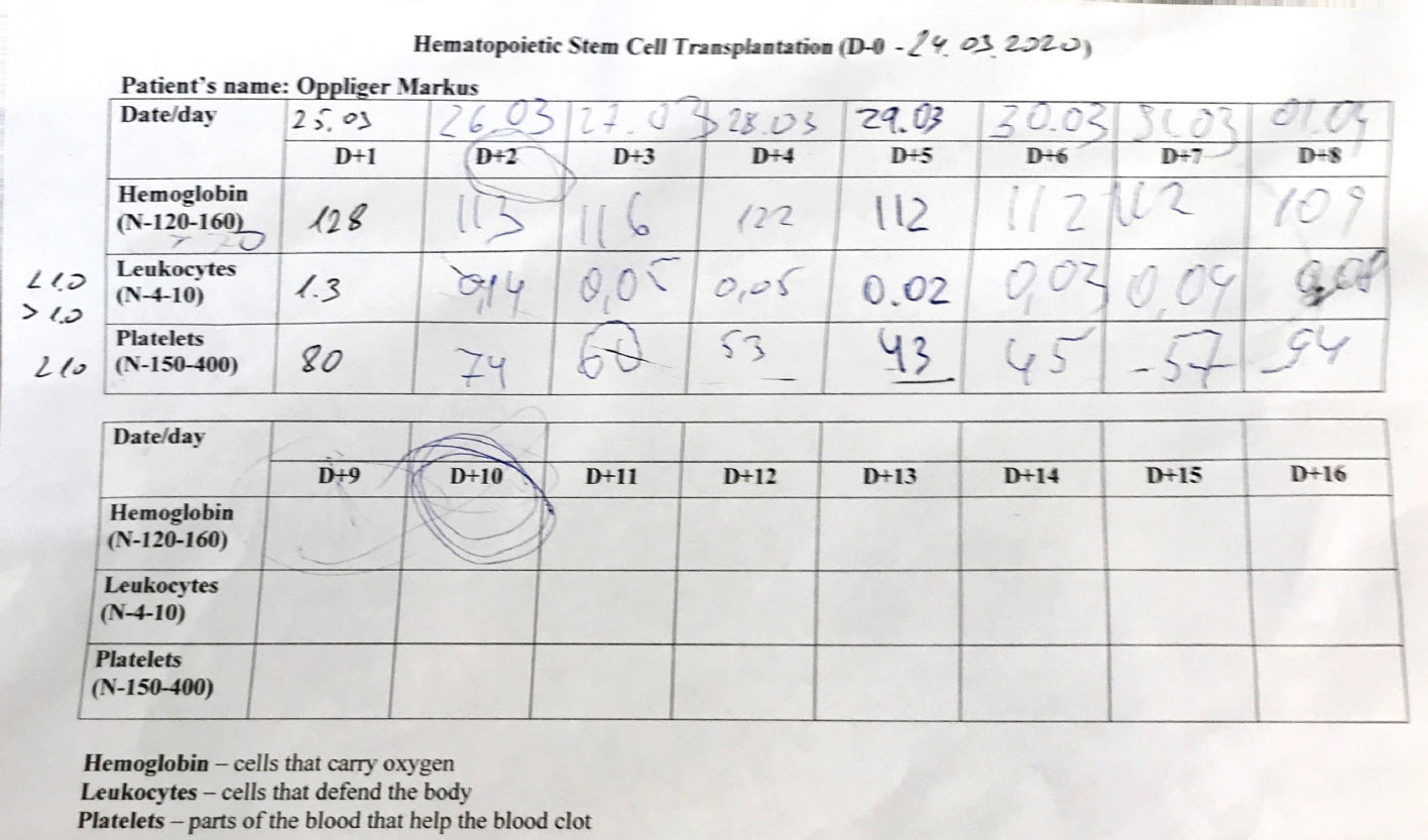 Täglich wurden mir die Blutwerte «Hämoglobin», «Leukozyten» und «Blutplättchen» gemessen. Für erklärende Worte zu diesen Begriffen sehen Sie bitte meinen Blogeintrag «Blutkörperchen».