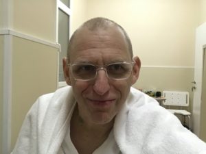 • Vor dem Frühstück kam die Pflegerin Olga vorbei, die mir die Kleider wechselte und mich rasierte. Erst in der Schweiz stellte ich fest, dass diese Rasur die letzte für mehrere Wochen war, da mir vorerst keine Haare mehr wuchsen.